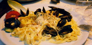 | 中に肉が入っているパスタ | オーストリアで食べた魚介類のパスタ |