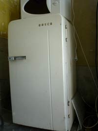 | BOSCHの年代物の冷蔵庫。マニアには高く売れそ〜 | 縦型ドラム式洗濯機。脱水まで1時間半はかかる |